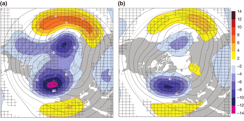 Mean systematic error of 500 hPa geopotential height fields (shading) for extended boreal winters (December–March) of the period 1962–2005. Errors are defined with regard to the observed mean field (contours), consisting of a combination of ERA-40 (1962–2001), and operational ECMWF analyses (2002–2005). (a) Systematic error in a numerical simulation with the ECMWF model IFS, version CY32R1, run at a horizontal resolution of T L 95 (about 210 km) and 91 vertical levels. (b) Systematic error in a simulation with a stochastic kinetic-energy backscatter scheme. Significant differences at the 95% confidence level based on a Student’s t -test are hatched (Franzke et al. 2015).
